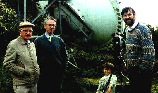 During the Spring of 1995, Lyle Patison, VK2ALU (seen here on the left) met up with Charlie Suckling, G3WDG (far right) at the G3WDG/G4KGC home QTH at Rushden, Northamptonshire. Charlie's large dish, used for what was then a world record 10GHz E.M.E contact with Lyle on the 18th August 1996, is visible behind the group. Between the two EMEers is Barry Chambers, G8AGN, a co-editor of the RSGB's Microwave Newsletter and a corresponding member of the RSGB Microwave Committee. The "little 'un" is G3WDG's junior operator...