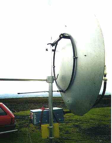 In 1997 I changed the antenna to a 1.2m diameter prime focus dish. This uses a scalar ring horn, the "Chaparall" feed, which came with the dish. Although commercially used on 11GHz, the feedhorn is still an excellent match on 10.3GHz.