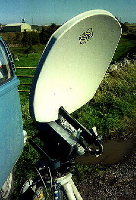 During 1996 I also used a separate 50mW Gunn transmitter, mounted on an identical dish to the one shown here (35cm diameter offset-fed type). The low power transceiver in this photo then became a receiver only. Both the units and their dishes are now mounted on a common horizontal boom on the tripod. With the increased transmit output power, I have extended my best 24GHz DX to 141km.